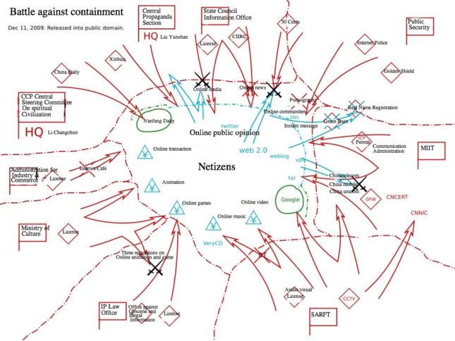 : Der Kampf gegen Chinas Internetzensur Global Voices Advocacy hat ein schönes Diagramm übersetzt, das den Kampf von Internetnutzern gegen die chinesische Internetzensur und ‑Manipulation visualisiert. Ohne Kenntnis der Materie ist es etwas schwer zu verstehen, aber schon die reine Fülle der von der chinesischen Regierung initiierten Maßnahmen ist beeindruckend: The red flags are government and party institutions involved in information […]