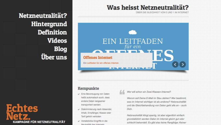: Echtes Netz – Kampagne für Netzneutralität Wir haben heute eine Preview-Version von „Echtes Netz – Kampagne für Netzneutralität“ gestartet. Mehr gibt es im neuen Jahr zu sehen, vorraussichtlich wird sich das ganze Design noch ändern und sicher werden noch mehr Kampagnenelemente dazu kommen. Ausbauen und aktualisieren werden wir auch noch diese Zeitleiste, wo wir die Debatte um Netzneutralität abbilden wollen: Inhalt […]