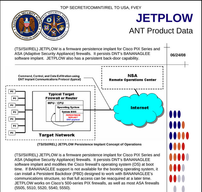 Ähnlich sind Server und Firewalls durch die NSA kompromittiert worden. Für HP (IRONCHEF, 0$) und Dell-Server (DEITYBOUNCE, 0$, GODSURGE 500$ für Kauf und Installation) gibt es jeweils BIOS- bzw. Hardware-Implantate, die der NSA einen Direktzugriff auf die Server ermöglichen, in den Hardware-Firewalls von Cisco werden durch die Software JETPLOW (0$) regelmäßig stabile Hintertüren integriert.