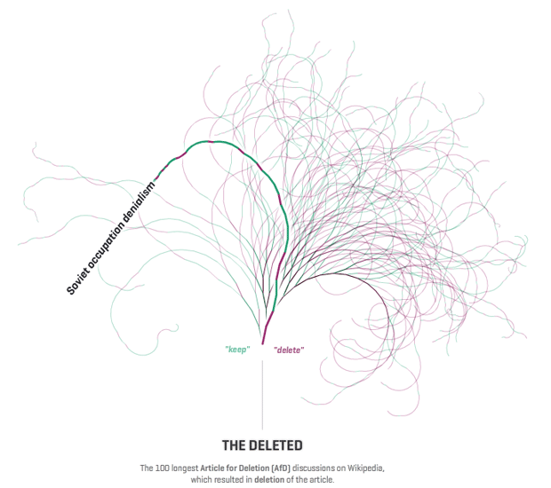 Eine schöne Visualisierung von Löschdiskussionen in der Wikipedia liefert die Seite notabilia.net