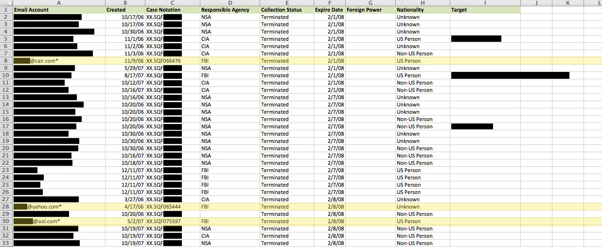 In der Tabelle finden sich laut Greenwald und Hussain 202 Email-Adressen die US-Bürgern zugeordnet sind, 1.782 gehören zu „non‑U.S. persons“, und bei 5501 weiteren ist keine Nationalität angegeben. Insgesamt sind es 7.485 Email-Adressen die zwischen 2002 und 2008 überwacht wurden. Seitdem habe sich keines der Überwachungsopfer etwas zu Schulden kommen lassen, weder terroristisch noch anderweitig.