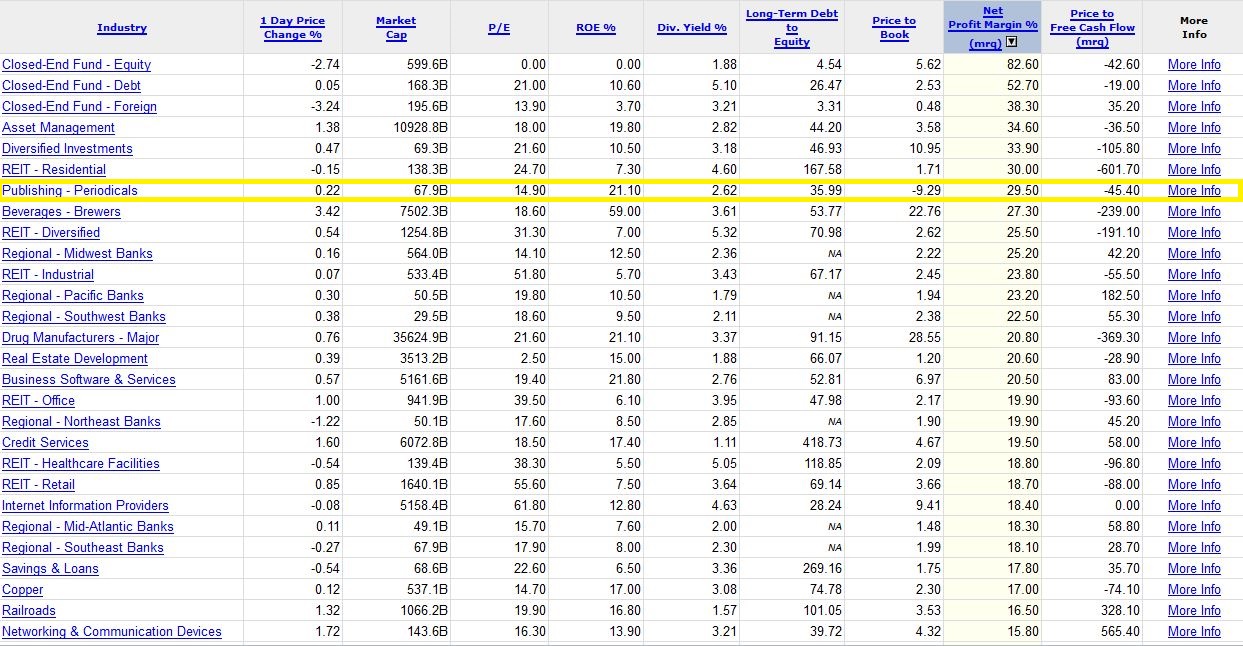 Heute bildet das Verlegen wissenschaftlicher Zeitschriften einen kleinen, aber hoch profitablen globalen Markt. Laut einem Report der International Association of Scientific, Technical and Medical Publishers erwirtschafteten die Verlage 2011 einen weltweiten Umsatz von etwa 9,4 Milliarden USD, wobei mindestens 70% auf die Subskriptionsgebühren öffentlicher Bibliotheken zurückgehen. Schätzungen zufolge liegt die durchschnittliche Rendite der Verlage wissenschaftlicher Zeitschriften zwischen 20% und 30%. Eine beeindruckende Größe, wenn man bedenkt, dass nur sehr wenige Branchen derart lukrativ sind: Profitträchtiger als das Verlegen wissenschaftlicher Zeitschriften ist nur der Finanzmarkt (siehe Tabelle). Allerdings besteht zwischen den Verlagen ein erhebliches Gefälle. Während das Gros der 5.000 bis 10.000 Verlage kaum die Gewinnschwelle erreicht, weisen die „Big 5″ kontinuierliche Erlösspannen zwischen 35% und 40% oder sogar darüber hinaus aus.