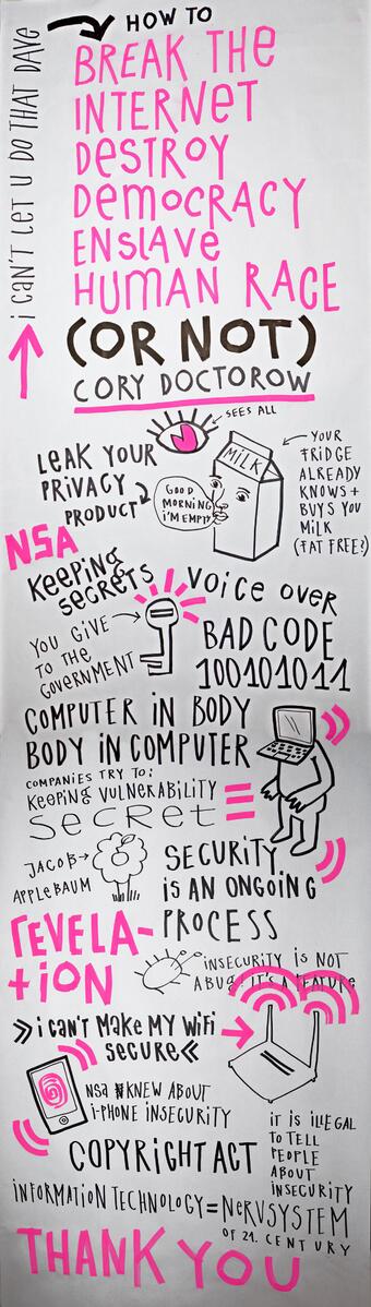 Doctorow berichtete von einem jungen Mann, der im November 2012 auf einer Sicherheitskonferenz in Australien eine Präsentation zu implantierten Defibrillatoren (Herzrhytmus-Stimulatoren) hielt. Der Takt des Herzschlages wird zur Implementierung genau programmiert und seine Recherchen ergaben, dass es ein Leichtes wäre, die Software der Defibrillatoren zu manipulieren und PatientInnen einen neuen Rhythmus aufzusetzen – um ihnen zum Beispiel mit Herzschocks auszusetzen, ganz nach (algo-) rhytmischen Belieben. Mit steigend technischer Abhängigkeit wachsen die Manipulationsmöglichkeiten gleichstark. Daher müssen bürgerliche Freiheiten in Verbindung mit Verbraucherschutzrechten realisiert werden, leitet Doctorow bereits zu Beginn ein. Aber was soll schon dabei sein, wenn XY weiß ob ich nachts 4 mal zum Kühlschrank gehe oder womit der automatische Nachfülldienst meinen Kühlschrank befüllt? Höchstwahrscheinlich könnte es sich bei XY um deine Krankenkasse handeln! Datenschutz muss sich unbedingt in Design ‚importieren’, das heißt, dass vernetzbare Produkte (Bügeleisen, Kühlschränke, TV-Geräte, Handys, Waschmaschinen usw.) so entworfen werden, dass sie vor ökonomisch motivierten Schnüfflern sicher sind. Daher appelliert er an Verbraucherschutz-Agenturen und Zentralen, intensiv mit DatenschützerInnen zu kooperieren.