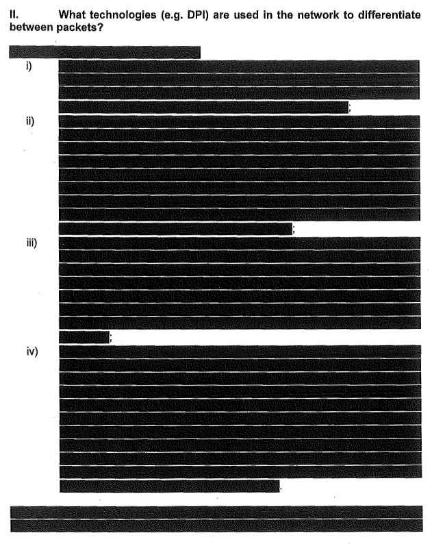 Pikant sind auch die Anmerkungen der Deutschen Telekom. Auf die Frage, „Welche Technologien (z.B. DPI) werden im Netzwerk eingesetzt, um zwischen Paketen zu unterscheiden?“, antwortet die Firma auf einer ganzen Seite mit vier Punkten und einem Absatz. Für uns wurden diese vollständig geschwärzt. Immerhin bekommen wir für das T‑Mobile-Netz bestätigt, dass dort die DPI-Hardware Cisco Service Control Engine eingesetzt wird. Das haben wir bereits vor zwei Jahren berichtet und erklärt: Der Unterschied zwischen Internet in Diktaturen und Deutschland ist nur eine Konfigurationsdatei. Aber Telekom und Vodafone verkaufen das als Feature.