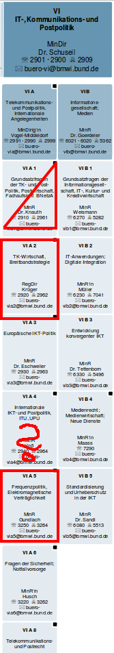 Der SPIEGEL von dieser Woche berichtete von einem Brief von Verkehrsminister Alexander Dobrindt, dass dieser die komplette Abteilung VI, zuständig für IT- Kommunikations- und Postpolitik“ zukünftig in seinem Ministerium haben wolle. Golem und Handelsblatt berichteten vergangene Woche, dass es nur die zwei Referate für Telekommunikationswirtschaft / Breitbandstrategie (VI A 2) sowie Frequenzpolitik (VI A 5) werden sollen. Wir haben hier den Organisationsplan des BMWi aus dem Jahre 2012 gefunden, der das visuell beschreibt. Einen aktuellen gibt es leider noch nicht.