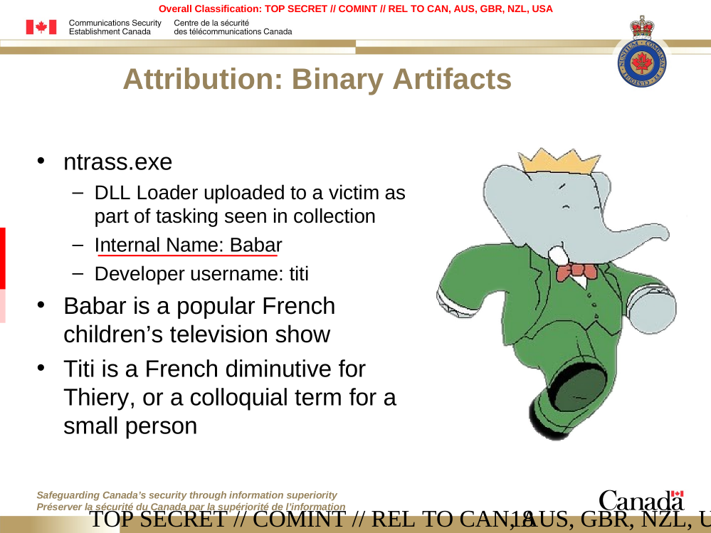 The internal project name of the analyzed malware is „Babar64“, which rings a bell when thinking back of documents leaked through Der Spiegel back in January. There, a slide deck originating from Communications Security Establishment Canada (CSEC) describes an alleged nation state malware named Babar. The samples at hand fit well with what is described in the CSEC document; and, as CSEC states they are suspected to originate from French intelligence.