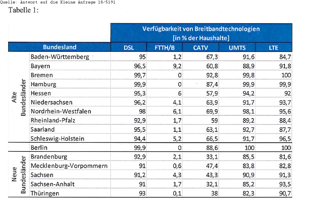 Die Linke-Fraktion wollte wissen, wie es um die Breitband-Infrastruktur in Deutschland bestellt ist und hat eine Kleine Anfrage an die Bundesregierung gestellt. Die Fragen lauteten, inwieweit die Bundesregierung Auskunft über die Breitband-Netzinfrastruktur in Deutschland geben kann, welche Infrastrukturen (Kabel, FTTB/H, usw.) in welchen Gebieten vorhanden sind und welche Unterschiede in der Infrastruktur zwischen den Ost- und Westbundesländern sowie städtischen und ländlichen Gebieten bestehen.