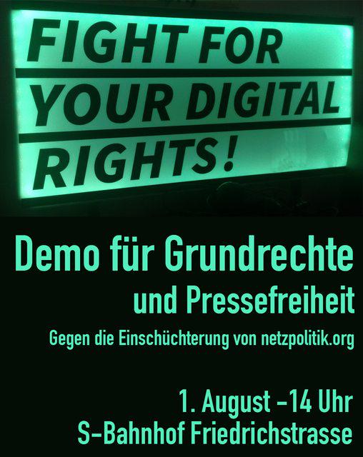 […] Berlin erklärt sich solidarisch mit netzpolitik.org und ruft zur Beteiligung an der Demonstration „Pressefreiheit ist kein Landesverrat“[1] morgen, 1. August 2015 auf. Treffpunkt ist 14 Uhr am S‑Bahnhof […]