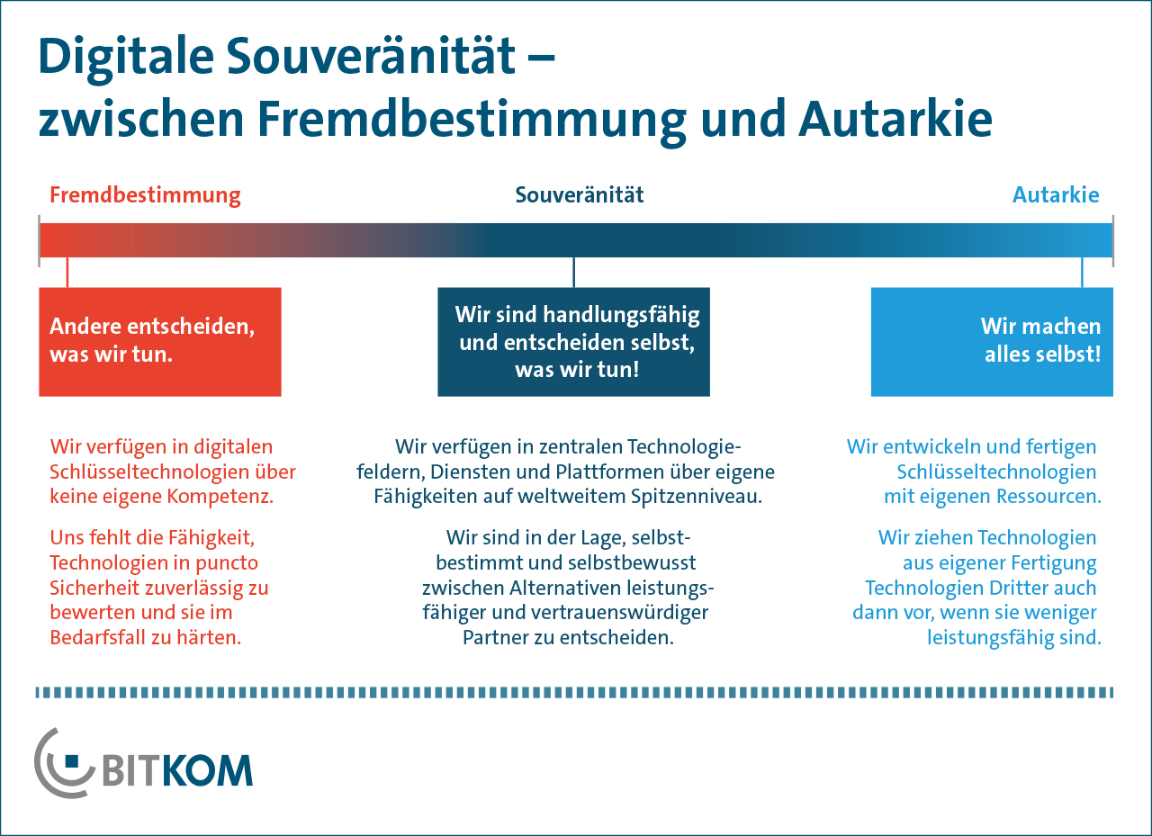 Klingt eher nach Medienkompetenz, doch das ist kaum das, was BITKOM hier meint. BITKOM siedelt Digitale Souveränität zwischen Fremdbestimmung und Autarkie an, als Fähigkeit „selbstbestimmt und