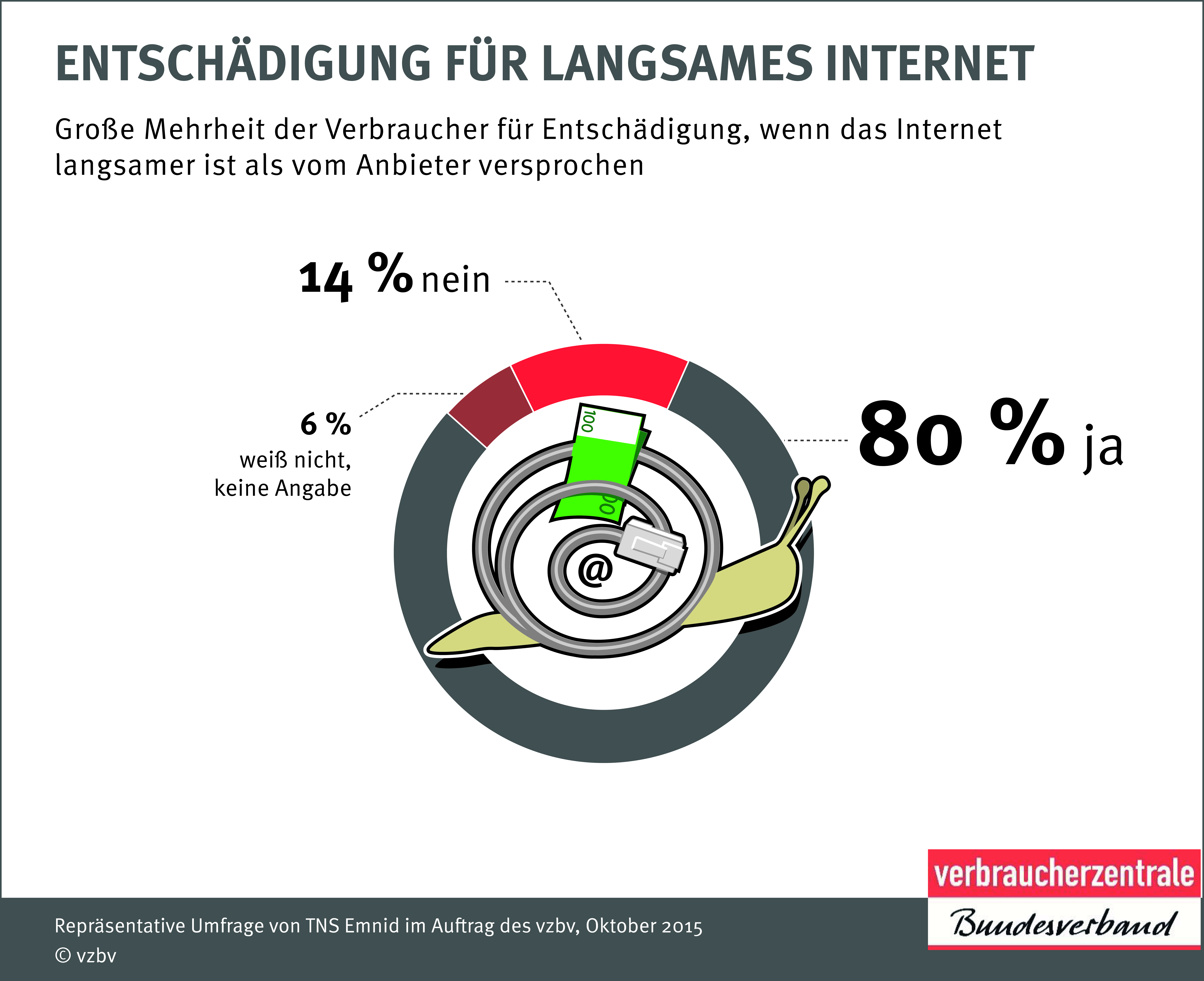 Wenn der Internetanschluss langsamer ist als vom Anbieter versprochen, sollten betroffene Kunden entschädigt werden, fanden 80 Prozent der Verbraucher. Um ein Prozent höher lag die Zustimmungsrate auf die Frage, ob deutsche Bürger ein Recht auf einen schnellen Internetanschluss haben sollten. Das ergab eine repräsentative Umfrage des Meinungsforschungsinstituts TNS Emnid im Auftrag des Verbraucherzentrale Bundesverbands (vzbv).