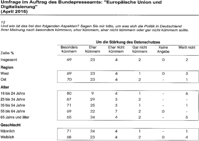 Ausgerechnet die, die heute munter bei Instagram & Co. posten, wollen, daß die Politik sich mehr um den Datenschutz kümmert? Und was bedeutet eigentlich „eher kümmern“? Ich lach mich schlapp. Eine der vielen Marktforschungsstudien, die ungelesen in den Papierkorb wandern kann.