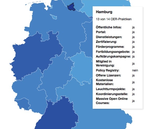 Schon bei der letzten Studie gab es in Deutschland keine weißen Flecken auf der OER-Landkarte mehr, das heißt jedes Bundesland war zumindest auf irgendeine Weise in Sachen OER aktiv. Mittlerweile bieten sämtliche deutschen Bundesländer öffentliche Informationen und Fortbildungsangebote zum Thema an und 15 von 16 zumindest kostenlose Materialien und ohne Registrierung zugängliche Online-Kursangebote (Massive Open Online Courses, MOOCs). Bei kostenlosen Materialien und MOOCs handelt es sich allerdings nicht notwendigerweise auch um OER, dafür wären offene Lizenzen wie z. B. Creative Commons erforderlich.