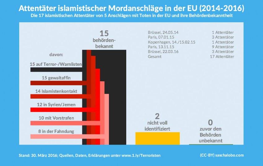 Zitat:„Von den 17 Attentätern sind zwei noch nicht abschließend identifiziert und können daher kaum sinnvoll betrachtet werden – aber alle 15 identifizierten Attentäter waren behördlich bekannt.“