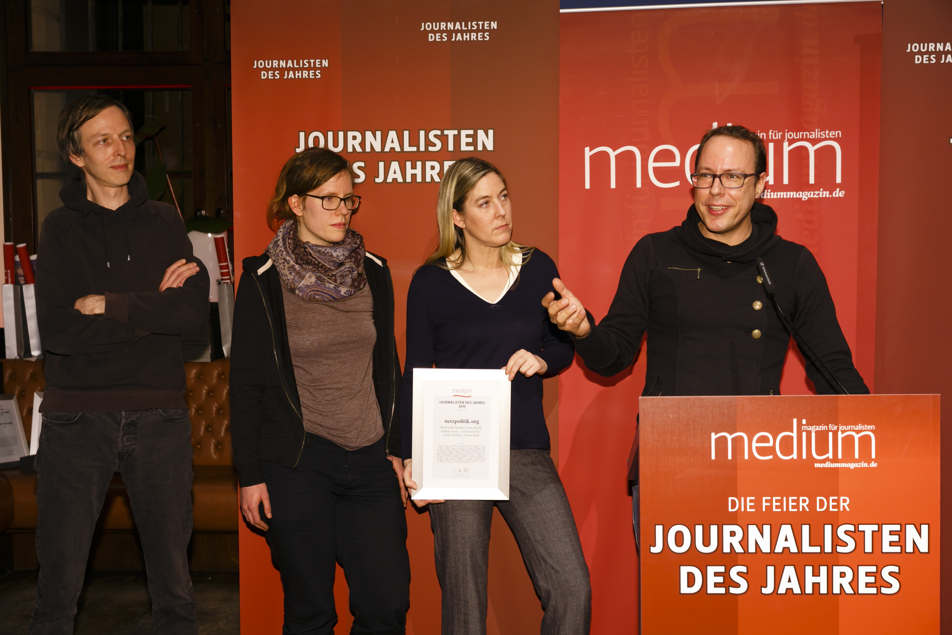 Am vergangenen Montag haben wir im Rahmen der Preisverleihung „Journalisten des Jahres 2015“ des Medium Magazin den ersten Preis in der Kategorie „Team des Jahres 2015“ verliehen bekommen.