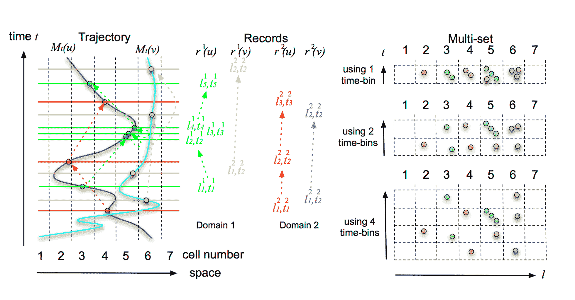 Two space-time trajectories with associated footprints in two domains.