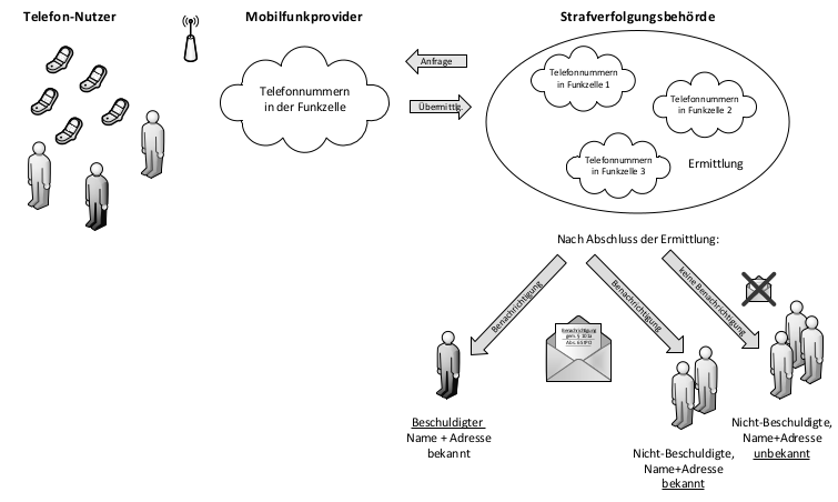 Die Strafprozeßordnung (StPO) regelt in § 100g Abs. 3 die Erhebung von angefallenen Verkehrsdaten in einer Funkzelle (Funkzellenabfrage). Die Betroffenen sind hierüber gemäß § 101a Abs. 6 StPO zu benachrichtigen: