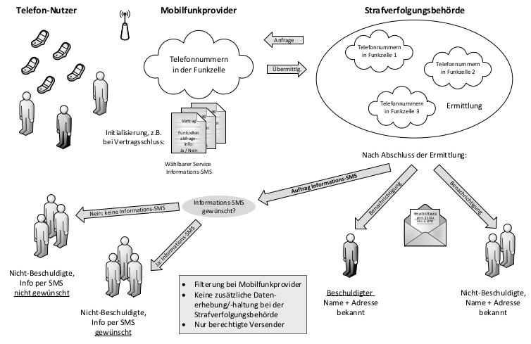Die Mobilfunkprovider müssten eine gemeinsame Liste der Nummern führen, die eine SMS-Information wünschen. Diese müsste aktuell gehalten werden und ggf. Nummernänderungen beinhalten. Kritisch wäre es, wenn diese Liste an Strafverfolgungsbehörden übermittelt würde. Eventuell könnten dann bei eintragungswilligen Personen Bedenken bestehen, dass die Strafverfolgungsbehörden irgendwelche Rückschlüsse aus der Aufnahme in die Liste ziehen könnten. Somit sollte der Abgleich zwischen den betroffenen Telefonnummern und der Liste durch die Mobilfunkprovider erfolgen, die dann auch den Versand der Nummern vornehmen. Alternativ könnten die Strafverfolgungsbehörden die SMS-Informationen von einer den Mobilfunkprovidern bekannten und für diese Zwecke eingerichteten Nummer versenden, und für diejenigen Anschlussinhaber, die keine Information wünschen, wäre eine Zustellung von dieser Nummer vom Mobilfunkprovider gesperrt. Eine Eingangsbestätigung der zugestellten (und nicht blockierten) SMS-Nachrichten dürfte nicht, oder jedenfalls nicht mit Nennung der Nummern, erfolgen.