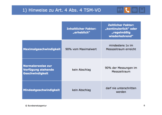 Die Maximalgeschwindigkeit soll demnach mindestens 90 Prozent des vertraglich vereinbarten Höchstwertes ausmachen und zumindest ein Mal im Messzeitraum erreicht werden, wohingegen die normalerweise zur Verfügung stehende Geschwindigkeit in mindestens 90 Prozent der Messungen geliefert werden muss, um nicht als „kontinuierliche“ oder „regelmäßig wiederkehrende“ Abweichung zu gelten. Auch für die Anzahl und Verteilung der Messungen soll es Vorgaben geben, um als valide anerkannt zu werden (siehe Abbildung unten).