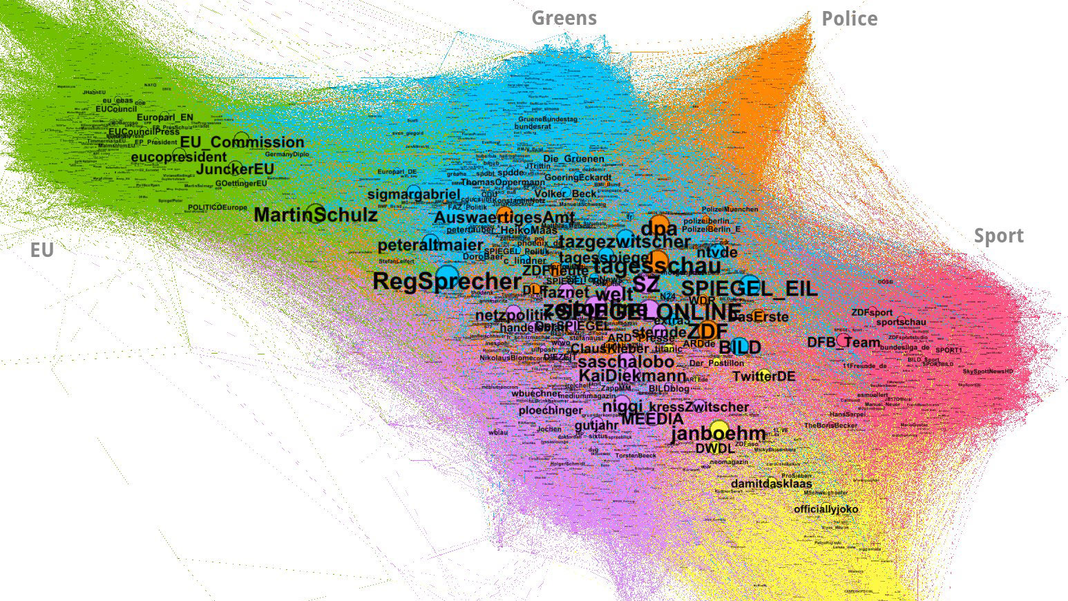 Eines hat die Polizei übrigens schon geschafft. Sie ist auf Twitter deutlich sichtbar. Wenn man verifizierte deutschsprachige Accounts analysiert, dann bilden die Ordnungshüter eine ganz eigene Wolke, wie Luca Hammer in einer Datenanalyse herausgefunden hat. Trotz der Popularität der Sozialen Medien bei der Polizei sind jedoch wichtige rechtliche Fragen ungeklärt, vieles bleibt in der Grauzone.
