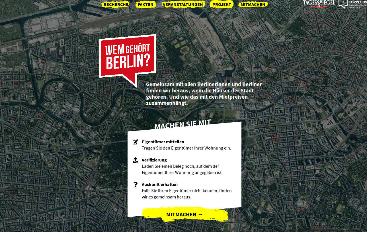 Der Tagesspiegel und Correctiv haben deshalb zusammen die Crowdrecherche „Wem gehört Berlin“ gestartet. Ziel der Kooperation ist, dass Mieter Informationen über ihre Vermieter sammeln und mit den Redaktionen teilen. Der Fokus der Recherchen liegt dabei auf der Eigentümerstruktur und den großen Finanzinvestoren sowie Unternehmen, die fragwürdig handeln.