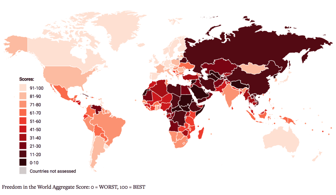 Der Jahresbericht beschreibt eine Einschränkung der Freiheitsrechte in vielen Ländern der Welt. Nach der Zählung von Freedom House gab es eine Verschlechterung demokratischer Standards in 71 Staaten, hingegen nur in 35 eine Verbesserung. Die drastischste Reduktion an Rechten beobachtet die NGO in der Türkei, wo die Regierung gegen kritische Journalisten und Oppositionelle vorgeht. Ins Visier genommen werden auch Russland und China, die durch autoritäre Praktiken wie die staatliche Kontrolle von Internetnutzung und sozialen Medien ein negatives Vorbild für andere Staaten darstellen.