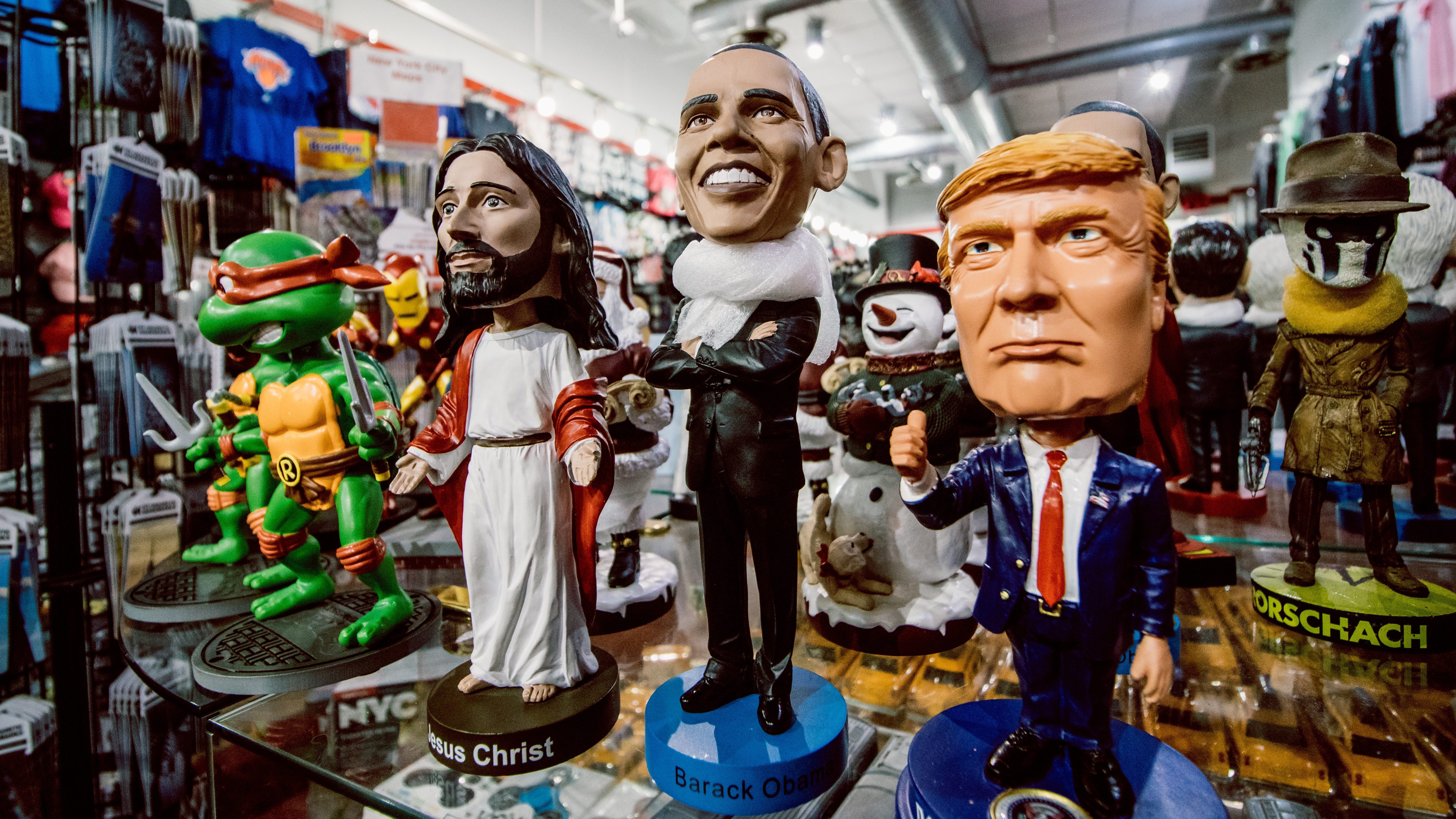 Mit Plänen für eine eigene Sendung macht Ex-Präsident Obama sein Image zur Ware. Im Bild: Puppen von Prominenten. Von links nach rechts: Ein Ninja-Turtle, Jesus, Obama und sein Nachfolger Donald Trump – Gemeinfrei-ähnlich freigegeben durch unsplash.com: Stephen Mayes