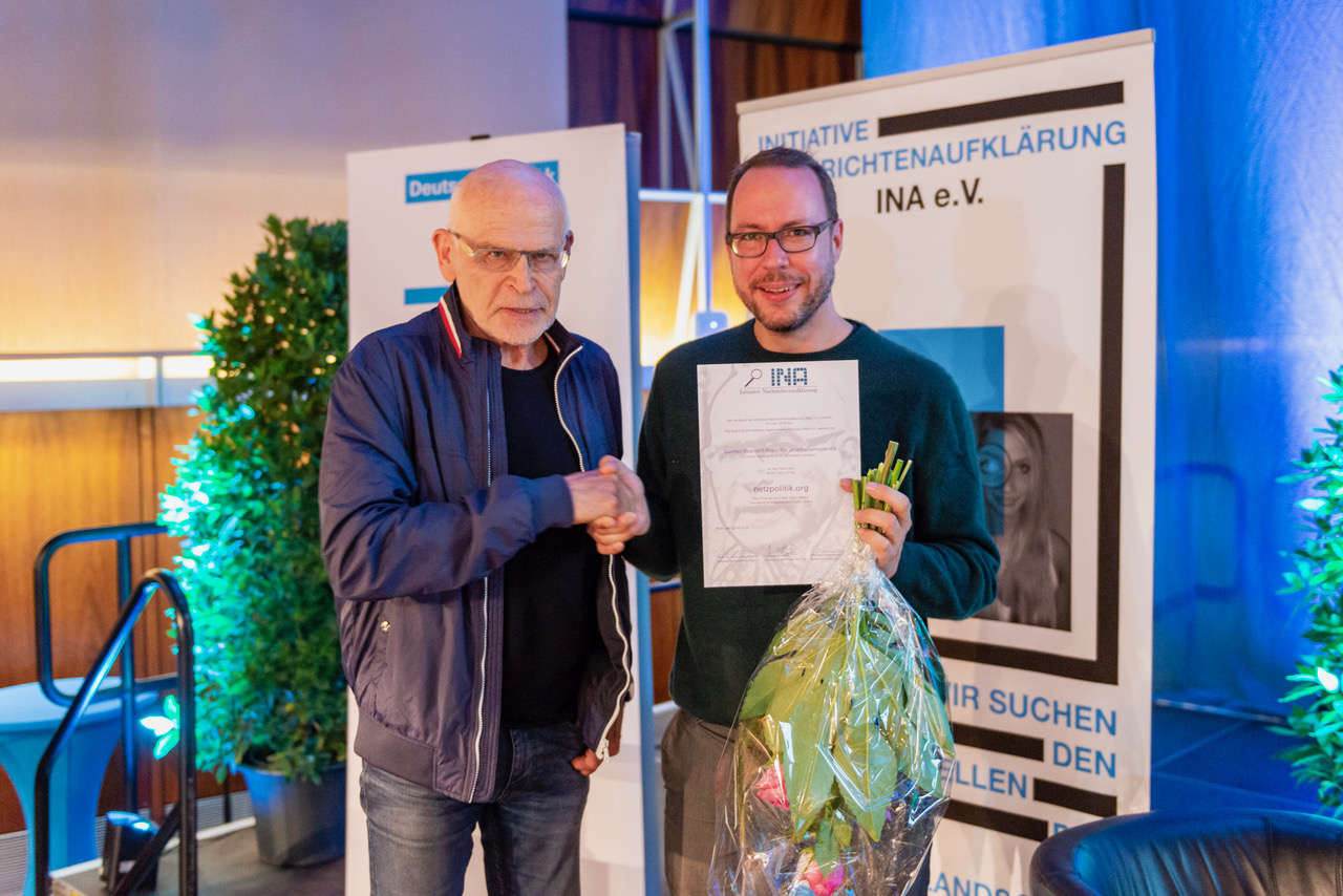 Die Initiative Nachrichtenaufklärung hat ihren Günter-Wallraff-Preis für Journalismuskritik an netzpolitik.org verliehen. Der legendäre Investigativjournalist übergab den mit 5.000 Euro dotierten Preis am Freitag im Rahmen des 4. Kölner Forums für Journalismuskritik unserem Chefredakteur Markus Beckedahl. Die Initiative Nachrichtenaufklärung hebt in seiner Würdigung hervor, dass wir uns „in herausragender Weise“ für Themen engagieren und dabei Artikel veröffentlichen, die in der Medienlandschaft sonst wenig bis gar nicht beleuchtet werden.