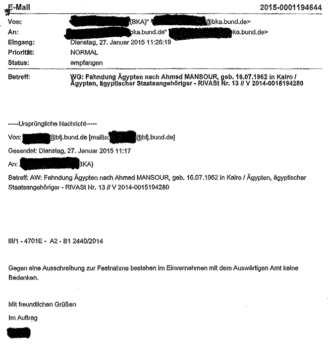In den letzten Jahren vertraten deutsche Behörden immer wieder eine gegensätzliche Auffassung zu internationalen Festnahmeersuchen. Vor drei Jahren hatte die Bundespolizei den ägyptisch-britischen Journalist Ahmed Mansour am Flughafen Berlin Tegel festgenommen. Über eine IFG-Anfrage ist der damalige Vorgang gut dokumentiert: Dem üblichen Prozedere folgend wurde die Festnahme der Generalbundesanwaltschaft gemeldet. Auch die britische und ägyptische Botschaft wurden durch die Bundespolizei informiert. Zur Festnahme hatte die Bundespolizei auffälligerweise geschrieben, Mansour sei aufgrund des bestehenden „internationalen Haftbefehls“ festgenommen worden. Es handelte sich aber um eine ausschließlich deutsche Fahndung, wie die IFG-Anfrage belegt.