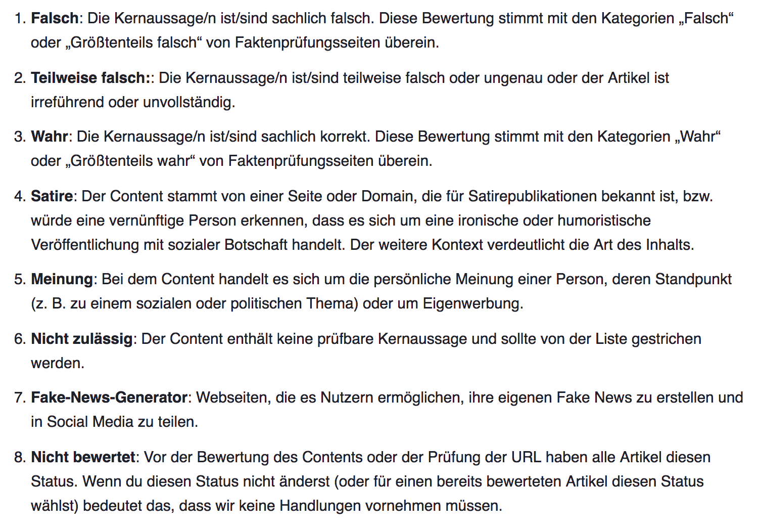 Screenshot der Beschreibung der Antwortkategorien in Facebooks Faktenprüfungstool