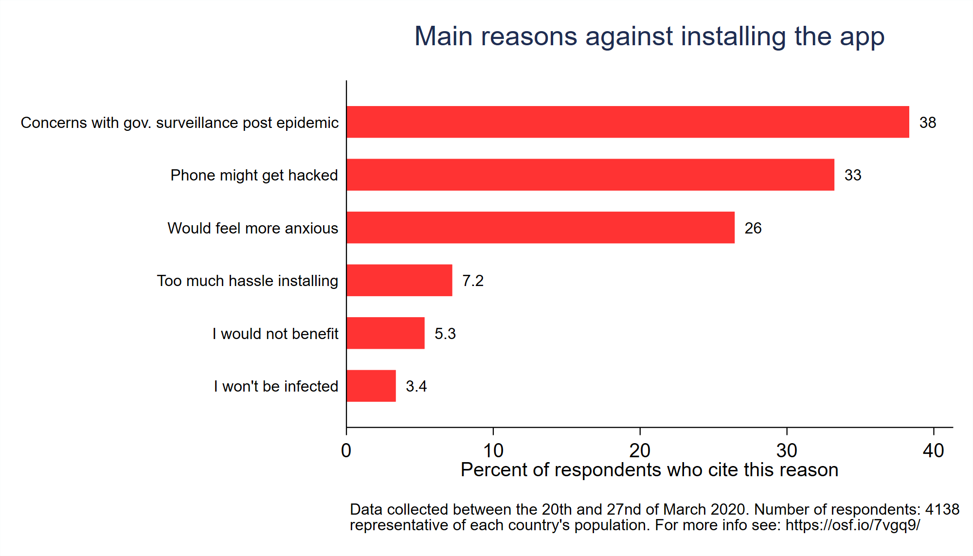 In the case of contact tracing, the approach that requires the least amount of data also seems to be the most effective epidemiologically. This is because an app like the one described above would be better suited to determine who actually was in close proximity than any of the other proposed solutions. Moreover, even digital contact tracing systems need users to cooperate (by installing the app and carrying their phones with them) for any chance of success. Consequently, the effectiveness of any contact tracing system depends on public support. There is reason to believe that the level of support can be increased by opting for a data-minimising solution. A representative survey across four countries shows that about 70 percent of respondents would install an app like the one described above on their phones (disclosure: Johannes Abeler, one of the co-authors of this article, is also the lead author of the survey study). The reason most frequently brought up against an installation is the worry that the government could use the app as an excuse for greater surveillance after the end of the epidemic (see Figure 3). If the government wants as many people as possible to install the app, it should take these concerns seriously and refrain from using location data. Contact tracing works without it.