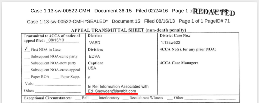 Auszug aus der Akte Lavabit (S. 67). : Lavabit sollte Postfach von Snowden herausgeben Einmal mit Profis: Die US-Regierung hat die Akte zum Fall Lavabit geöffnet, aber leider entscheidende Schwärzungen vergessen. Demnach ist nun klar, was zuvor nur spekuliert wurde: Die Behörden forderten vom E‑Mail-Anbieter Lavabit Zugriff auf das Postfach von Edward Snowden. Die auf Cryptome veröffentlichte Dokumentensammlung (pdf, 140 MB) zum Fall Lavabit enthält trotz zahlreicher Schwärzungen den entsprechenden […]