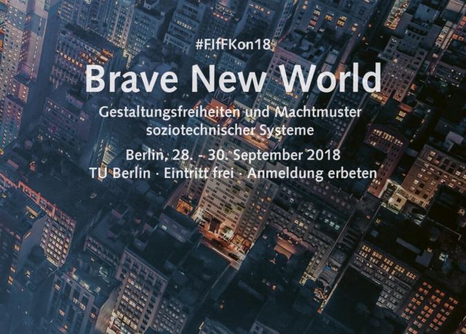 : Brave New World: Die FIfFKon am Wochenende in Berlin Diesen Freitag beginnt in Berlin die Konferenz FIfFKon unter dem Motto „Brave New World – Gestaltungsfreiheiten und Machtmuster soziotechnischer Systeme“. Bis Sonntag wird ein umfangreiches und vielschichtiges Tages- und Abendprogramm geboten. Die Teilnahme ist kostenlos.