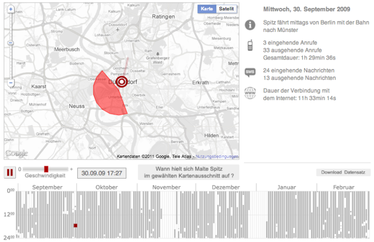 : Wie viel Vorratsdaten über uns verraten Malte Spitz (Grüne) hat sich von der Telekom seine Vorratsdaten erklagt, und sie von Open Data City für Zeit Online auswerten lassen. Die Bewegungsdaten seines Handys wurden noch mit Blogeinträgen und Tweets verknüpft und alles zusammen übersichtlich optisch aufbereitet: Auf einer Google-Map kann man seine Bewegungen verfolgen, daneben sieht man, was er am jeweiligen Ort […]