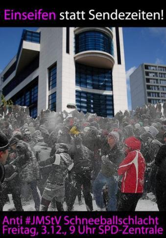 : Trotz der Kälte: JMStV-Protest wird auf die Straße getragen Jörg-Olaf hat sich hier monatelang Hand-Krämpfe gegen den JMStV geschrieben. Wohl aus Solidarität wollen sich Aktivisten er Hedonistischen Internationale morgen früh um 9:00h die Hände abfrieren. Sie laden zur großen Protest-Schneeballschlacht vor dem Willy-Brandt-Haus der SPD. Eine interessante Form des Protests, alle JMStV-Gegner sind eingelanden.