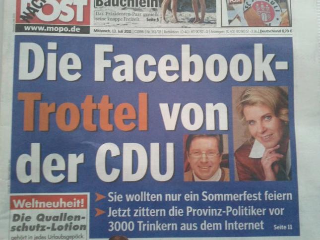 : „Die Facebook-Trottel von der CDU“ Seit dem Sinnieren darüber, Facebook-Parties zu verbieten ist es ja ein bisschen zum Volkssport geworden, CDU-Veranstaltungen auf Facebook zu suchen und zu besuchen. Teilweise hat auch DIE PARTEI ungefragt & ehrenamtlich die Social-Media-Betreuung für die CDU übernommen. Die party-freudigen Facebook-Nutzer bekommen in der Berichterstattung sogar ein bisschen Anonymous-Karma: Das CDU-Sommerfest im Schleswig-Holsteinischen Hasloh ist geplatzt – es wurde […]