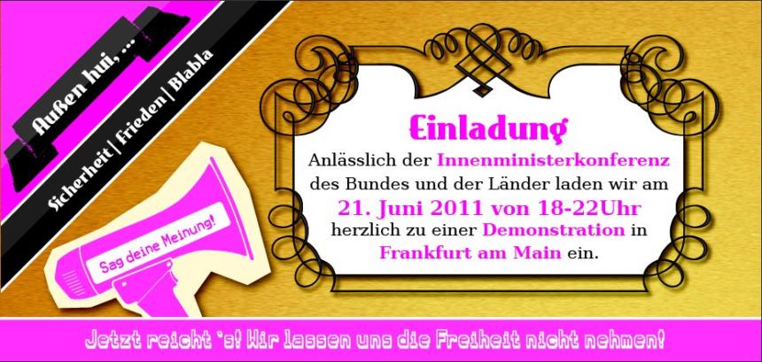 : Frankfurt: Demo gegen Überwachung Morgen (Dienstag, 21.06.) findet anlässlich der Innnenministerkonferenz in Frankfurt /Main eine Demonstration gegen Überwachung und Vorratsdatenspeicherung statt. Los geht es um 18:00h am Bahnhofsvorplatz, um dann dieser Demoroute zur Paulskirche zu folgen. Zu der Demo ruft ein breites Bündnis auf, darunter AK vorrat, AK zensur, Piratenpartei, FoeBuD und andere auf. Auch heute und am Mittwoch […]