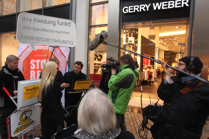 : FoeBuD enttarnt RFID-Chips in Kleidung In einer publikumswirksamen Aktion vor einem Geschäft der Bekleidungskette „Gerry Weber“ in Bielefeld lasen Aktivisten die Daten von in der Kleidung eingenähten Funkchips aus. Eine Reportage der ARD, die die Aktion mit einem Kamerateam begleitete, wird nächsten Montag ab 21 Uhr auf WDR ausgestrahlt. Die sogenannten RFID-Chips haben eine Reichweite von bis zu acht Metern […]