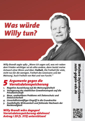 : Vorratsdatenspeicherung: Was würde Willy tun? Dennis Morhardt und Christian Soeder haben für den SPD-Parteitag eine schöne Zielgruppenkompatible Postkarte mit Argumenten gegen die Vorratsdatenspeicherung gebastelt und drucken lassen: