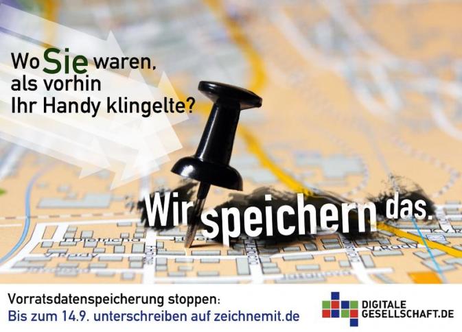 : Standortdaten: Wir speichern das! Auch wenn das ambitionierte Ziel von 50.000 Mitzeichnern für die Petition gegen die Vorratsdatenspeicherung bis zum 14.9.2011 im Moment etwas unerreichbar aussieht, kann man es ja trotzdem versuchen. Hier ist ein weiterer Mobilisierungsbeitrag, der uns von Alexander Svensson zugeschickt wurde. Wie immer gilt: Das Bild kann gerne weiterverwendet werden, um z.B. andere Menschen auf die […]