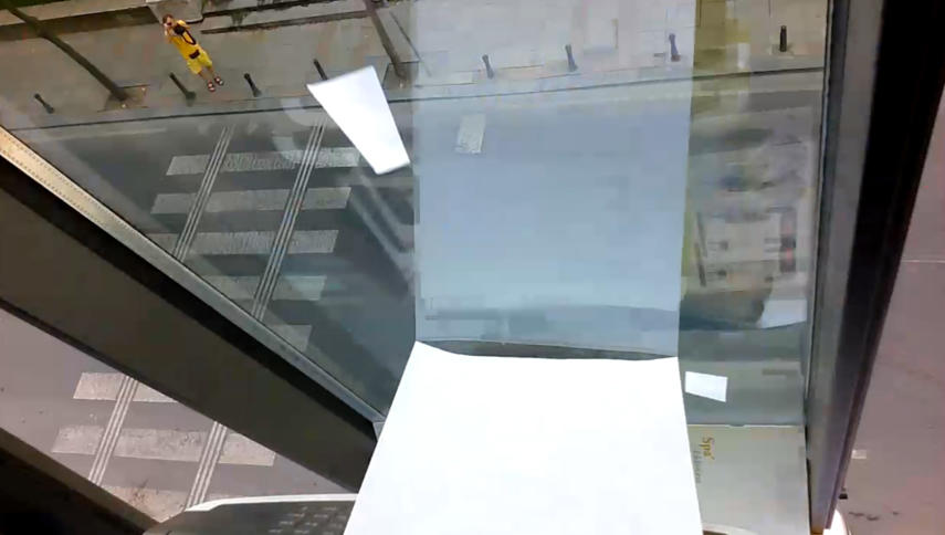 Ein Drucker am Fenster druckt Flugblätter gegen Erdogan. Sie fliegen aus aus dem Fenster auf die Straße. (Screenshot Video) : Ferngesteuerter Drucker wirft Flugblätter gegen Erdoğan am Gezi-Park ab Aktionskünstler vom Zentrum für politische Schönheit haben mit einer technisch raffinierten Installation Flugblätter auf den Gezi- Park in Istanbul herabregnen lassen, auf denen sie „Tod dem Diktator!“ fordern. Die türkische Polizei leitete Ermittlungen ein und fahndet nach einem Verdächtigen. Wir veröffentlichen exklusiv zwei Videos des ferngesteuerten Druckers in Aktion.