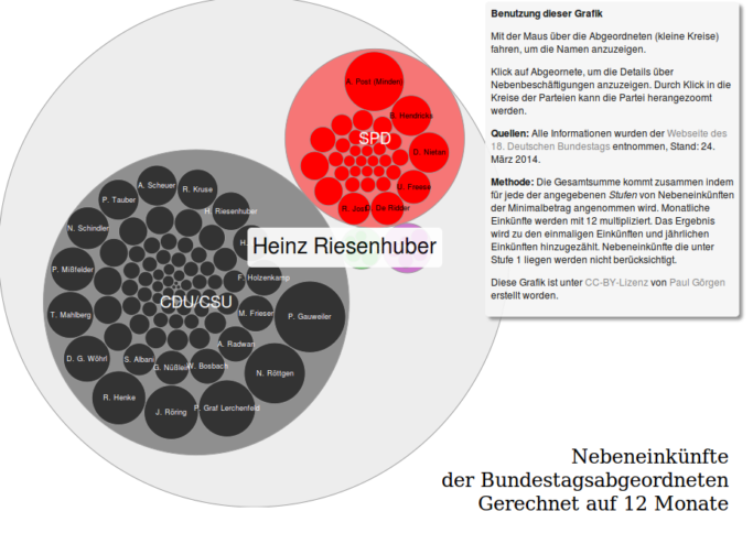 : Datenvisualisierung der Abgeordneten-Nebeneinkünfte Über die neuen Transparenz-Angaben zu Nebeneinkünften von Bundestagsabgeordneten auf bundestag.de haben wir vergangene Woche berichtet. Dort sind die Daten etwas dezentral auf den einzelnen Abgeordnetenseiten versteckt. Die erste schöne Visualisierung der Daten kommt von Paul Görgen.