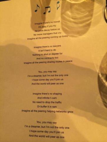 : Imagine there’s no transit Vertreter von diversen europäischen Internetknoten treffen sich gerade in Leeds beim Euro-IX-Treffen der European Internet Exchange Association. Dabei geht es dort auch um Politik, wie dieser Songtext zeigt, der anscheinend beim Abendessen gemeinsam gesungen wurde. Imagine there’s no transit Itś easy if you try No price decay below us No more managers that cry Imagine […]