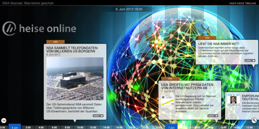 : Heise-Zeitleiste zum NSA-Überwachungsskandal Nach Al Jazeera und etlichen Hobbyprojekten hat jetzt auf Heise eine umfangreiche Zeitleiste zum NSA-Überwachungsskandal gebaut. Das Ergebnis basiert auf Tiki-Toki und sieht schick aus: