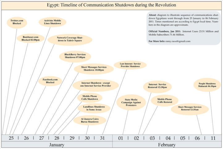: Visualisierung des Internet-Shutdowns in Ägypten Eine Grafik von Ramy Raoof visualisiert anschaulich auf einer Zeitschiene den Internet-Shutdown in Ägypten im Frühjahr diesen Jahres: Grafik steht unter der CC-BY-Lizenz.