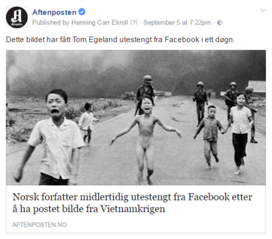 Screenshot des Facebook-Postings der Aftenposten. : Napalm-Mädchen: Facebook zensiert ikonografisches Kriegsbild Nachdem die norwegische Zeitung Aftenposten das wohl bekannteste Foto der Kriegsfotografie auf Facebook gepostet hatte, dauerte es nicht lange bis das Unternehmen die Zeitung aufforderte, das Bild zu löschen. Die Zeitung reagierte nicht auf die Aufforderung, da löschte Facebook in weniger als 24 Stunden das ikonografische Foto des nackten Mädchens und auch den dazugehörigen Artikel. […]