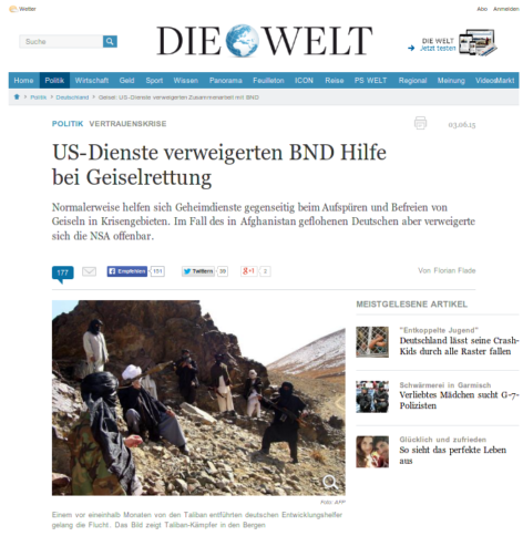 : Dementi der Bundesregierung: “Tatsächliche Einschränkungen“ in der Kooperation mit der NSA nicht belegbar Im Zuge der NSA-BND-Affäre erschienen zuletzt auch Gefälligkeitsartikel zur Ehrenrettung des deutschen Auslandsgeheimdienstes. Behauptet wurde etwa, die kritische Aufarbeitung hierzulande habe dazu geführt dass die US-Regierung dem Bundesnachrichtendienst mittlerweile Informationen vorenthalte. Zeitungen ohne Zugriff auf Snowden-Dokumente titelten “US-Dienste verweigerten BND Hilfe bei Geiselrettung“ oder “Wer nicht bespitzelt werden will, muss fühlen“. Behauptet wurde ebenfalls, eine […]