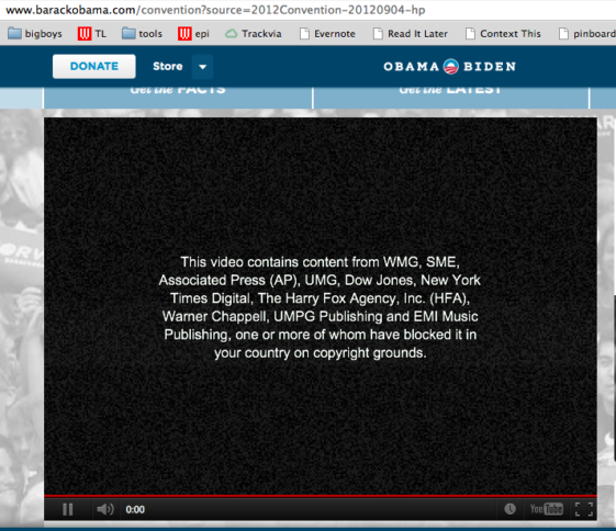 : Zensur durch Copyright: Nach Mars Rover und Hugo Award blockiert YouTube nun auch Barack Obama Derzeit ist der Mitschnitt des ersten Tages des Parteitags der amerikanischen Demokratischen Partei auf YouTube blockiert. Die Begründung ist mal wieder der übereifrige Copyright-Filter, den Medienunternehmen automatisch füttern können. Erst kürzlich hat es auch die amerikanische Raumfahrtbehörde NASA und auf Ustream den Science-Fiction Leserpreis Hugo Award getroffen. Statt der Rede von First Lady Michelle Obama […]