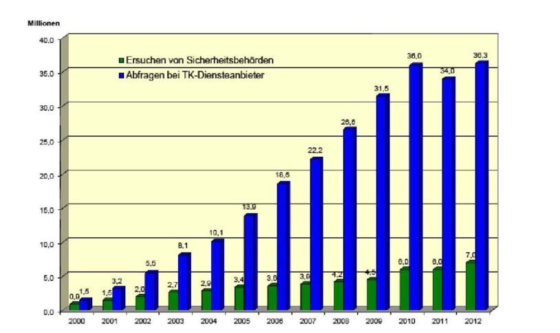 Statistik der Bundesnetzagentur: Anzahl bearbeiterer Ersuchen gemäß <a href="http://www.gesetze-im-internet.de/tkg_2004/__112.html">§ 112 TKG</a> Bestandsdatenauskunft 2012: Deutsche Behörden identifizieren alle fünf Sekunden einen Anschlussinhaber Deutsche Behörden haben im letzten Jahr sieben Millionen Inhaber von Festnetz‑, Mobilfunk- oder E‑Mail-Anschlüssen identifiziert. Das geht aus offiziellen Zahlen der Bundesnetzagentur hervor, die den 250 Behörden ein automatisiertes Auskunftsverfahren zur Verfügung stellt. Durch die Neuregelung der Bestandsdatenabfrage und die Aufnahme von IP-Adressen dürften die Zahlen weiter steigen.