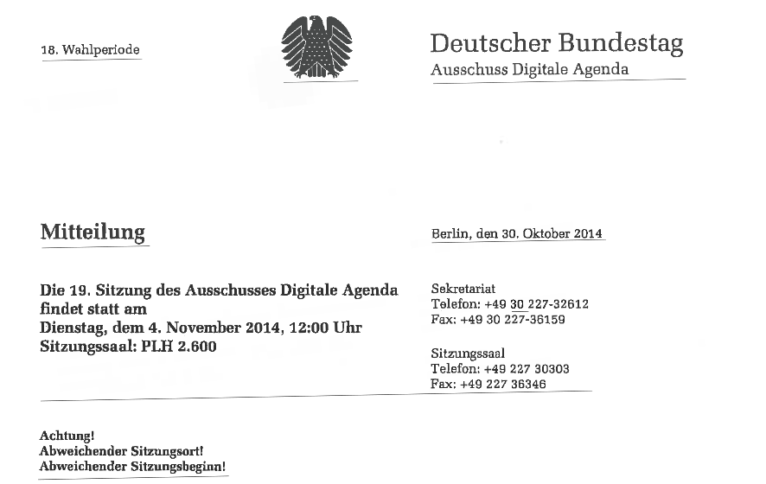 : Heute im Bundestag: 26. Sitzung des Ausschusses Digitale Agenda (wie immer nicht-öffentlich)