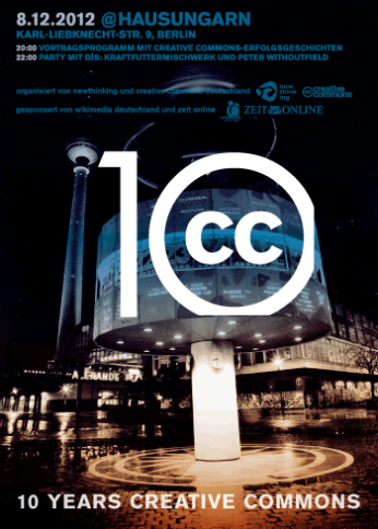 : Am 8.12. in Berlin: 10 Jahre Creative Commons â Party Im Dezember wird Creative Commons zehn Jahre alt. Wir feiern das in Berlin mit einer Party am Samstag, den 8.12. im HomeBase Club am Alexanderplatz (Ex HBC/Haus Ungarn). Zuerst gibt es rund zwei Stunden lang Programm mit KurzvortrĂ€gen und Interviews darĂŒber, wie Creative Commons Lizenzen in vielen unterschiedlichen Bereichen dazu beigetragen haben, eine Kultur des [âŠ]